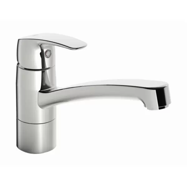 Смеситель для кухни c поворотным изливом. Угол поворота излива 100º (заводская установка), может быть изменен. Двухкомпонентная прочная рукоятка обеспечивает удобство использования. Встроенные опции ограничения температуры и напора воды. F = Гибкая подводка.