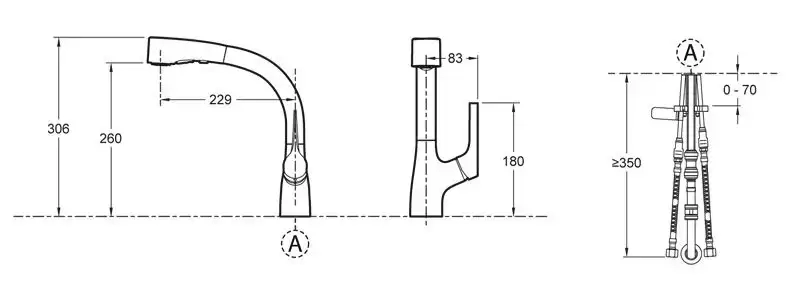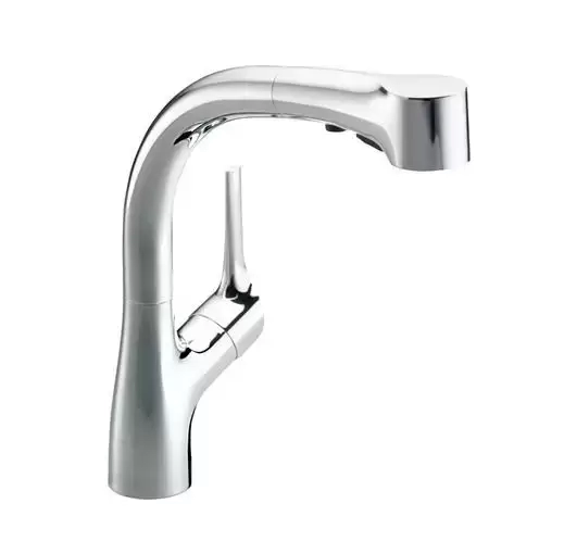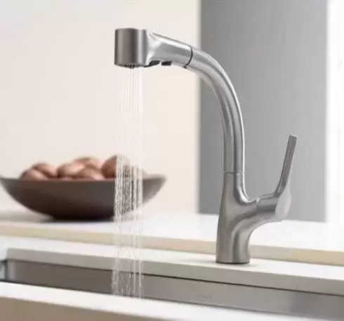 Смеситель оснащен вытяжным изливом, сбоку расположен удобный рычаг.