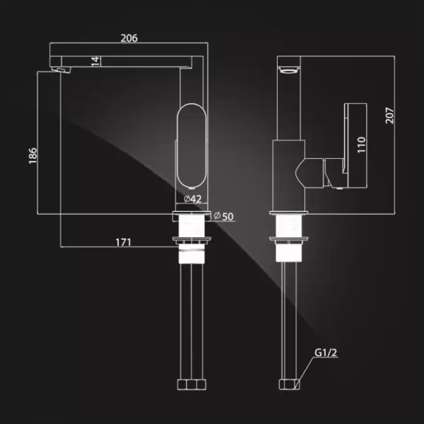 Небольшой элегантный смеситель для кухни. Длина излива 174 мм. Расстояние от поверхности столешницы до аэратора 186 мм. В комплекте идет трубчатый крепеж.