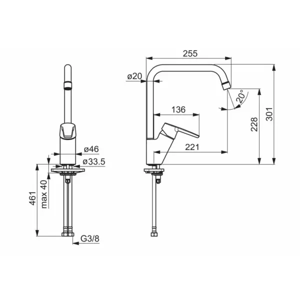 Смеситель для кухни с высоким изливом. Поворотный излив и аэратор. Заводская установка угла поворота излива 120° (может быть ограничен до 60°). Встроенная опция ограничения расхода и температуры воды. F= с гибкой подводкой.