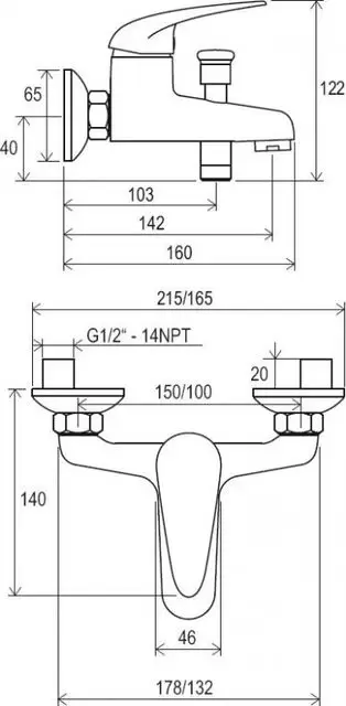 Настенный смеситель для ванны с керамическим картриджем и переключателем "ванна/душ", без гарнитуры.