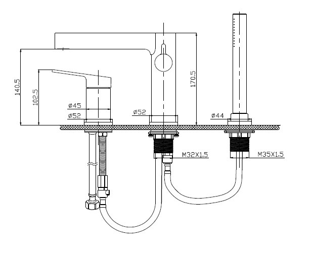 Оснащение: Смеситель, излив для ванны с девиатором, ручной выдвижной душ