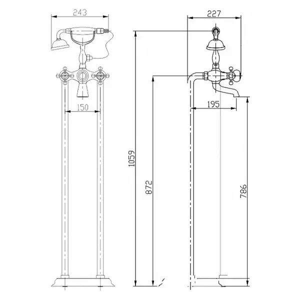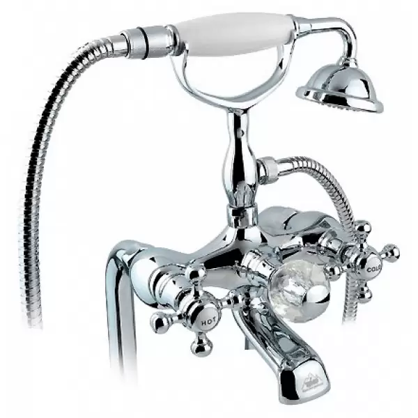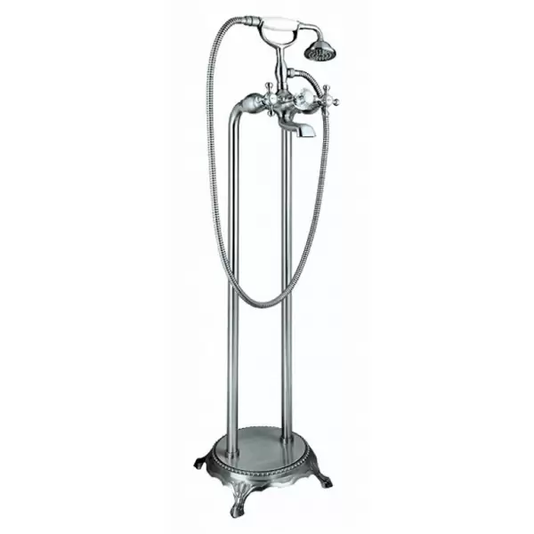 Она оснащена традиционным двухвентильным смесителем, в котором для регулировки холодной и горячей воды предусмотрено два крана. Удобный ручной душ пригодится вам в процессе быстрых гигиенических процедур, а для наполнения ванны предусмотрен специальный излив. Душевая система предусматривает простую напольную установку.