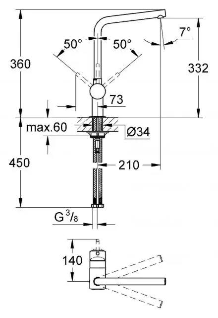 Однорычажный смеситель для кухни из серии Grohe Minta с высоким Г-образным изливом станет украшением интерьера кухни. Благодаря настраиваемому углу поворота излива (0°/150°/360°) устройством очень удобно пользоваться, например, мыть овощи, фрукты, наполнять любые емкости водой, производить уборку труднодоступных мест. Литой корпус изготовлен из прочной латуни, не боящейся коррозии.