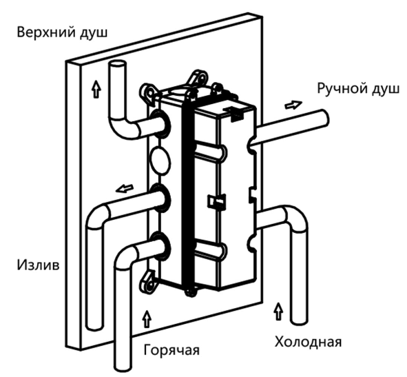 Встраиваемые смесители состоят из внешней части (которая видна потребителю) и скрытой внутренней части, которая управляет водонапорным процессом. Излив - это составная часть смесителя, из которой непосредственно льется вода.
