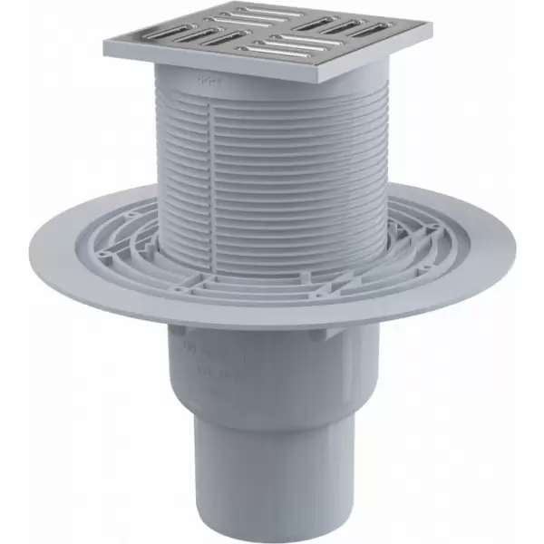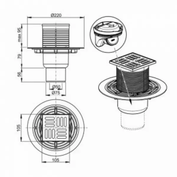 Сливной трап 105 × 105/50/75, подводка – прямая, решетка – нержавеющая сталь, гидрозатвор – мокрый.