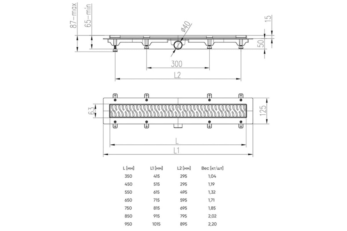 Нижняя часть и рамка желоба изготовлена из PP и PS, решетка изготовлена из нержавеющей стали DIN 1.4301, с возможностью нагрузки K3 (до 300 кг).