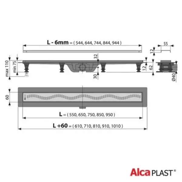 Желоб водоотводящий L 650 мм, пластик, с решеткой из нерж. стали, матовый, APZ10-650M Alcaplast.