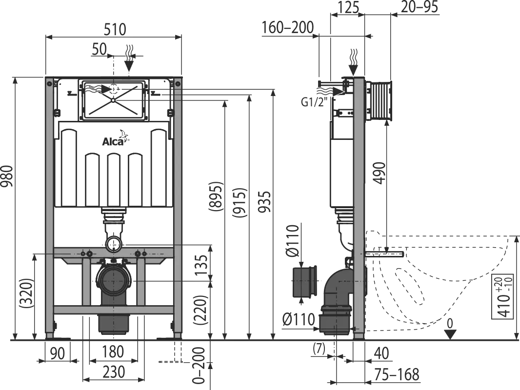 - При помощи выдвижных ножек рамы можно предустановить высоту унитаза в диапазоне 200 мм