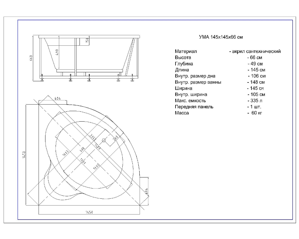 Современный материал, акрил, который использован для изготовления представленной модели угловой ванны 145х145 Ума, обладает прекрасными технологическими, экологическими, гигиеническими и эстетическими показателями. Он легко очищается самыми простыми бытовыми средствами, не меняет цвет, не подвержен ржавчине и не царапается. А при необходимости легко чинится и восстанавливается.