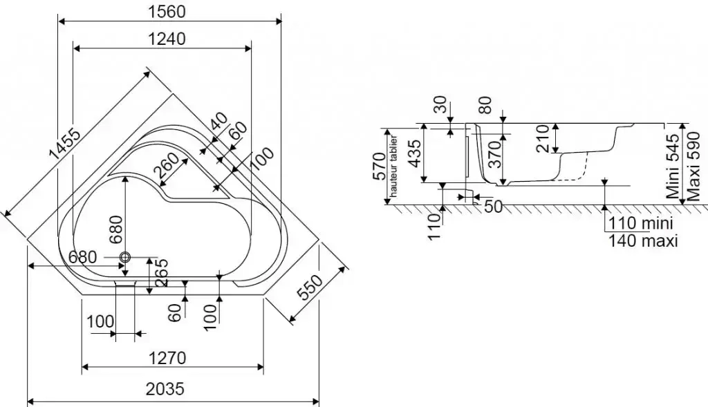 Левосторонняя акриловая ванна c ножками в комплекте.