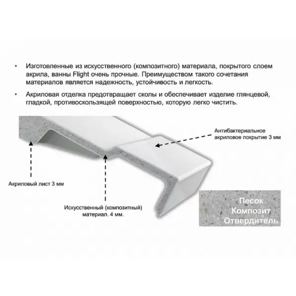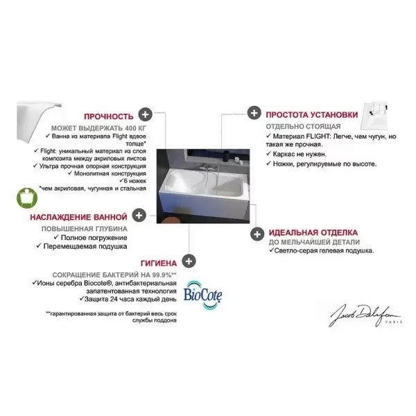 Технология Flight – это уникальный материал, запатентованный Jacob Delafon, состоящий из слоя композита между двумя слоями листа чистого литьевого акрила. Общая толщина около 12 мм. Для сохранения безупречной чистоты ванны ELITE оснащены специальным антибактериальным покрытием BioCote®. Антибактериальная технология с ионами серебра вживляется в продукт на стадии производства. В материале использованы ионы серебра, которые обладают признанными в медицине антибактериальными свойствами. Материал с активными ингредиентами BioCote® уменьшает уровень возникновения бактерий на 99.9%. 24 часа каждый день Ваша ванна остается чистой.