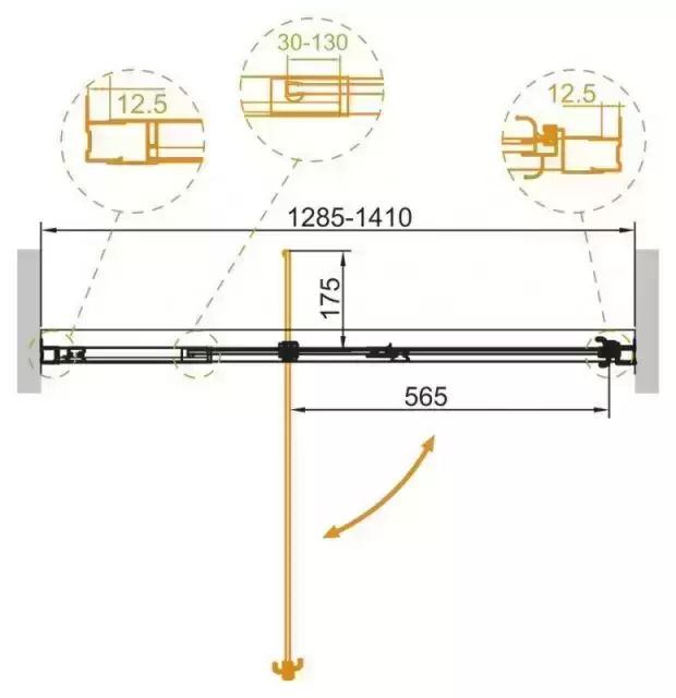 ОБРАТИТЕ ВНИМАНИЕ: конструкция петли позволяет регулировать ширину входа душевого ограждения в диапазоне 10 см.
