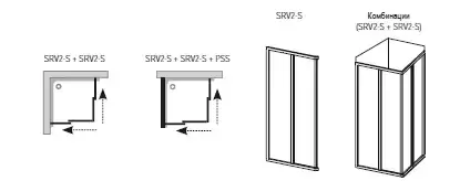 Каждое изделие является половиной душевого уголка и состоит из одной неподвижной и одной раздвижной части. Сочетая части разной ширины, можно создать душевой уголок практически любых размеров. Возможно также создание U-образного душевого уголка, как комбинации двух SRV2-S и одной PSS неподвижной стенки.
