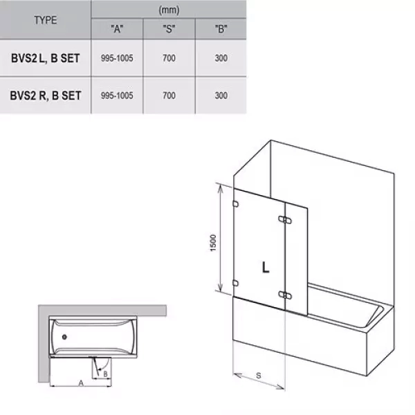 - Окончательная регулировка изделия возможна до 1,5 см в каждую сторону. Подходит для классических прямоугольных ванн с ровным передним бортом. Подвижная часть шторки открывается наружу ванны. Стандартная высота изделия - 1500 мм. Левый и правый варианты - согласно расположению петель на стене.