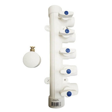 Коллектор 32/5*20w с воздухоотводчиком синий ТТ000014941 MeerPlast имеет входной диаметр 32 мм и 5 выхода диаметром 20 мм с кранами. Коллектор служит для параллельного подсоединения распределительных коллекторов к одному источнику.